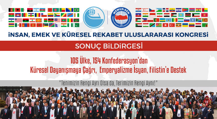 İstanbul'da 4-5 Mayıs tarihlerinde gerçekleştirilen ve dünyada büyük yankı uyandıran "İnsan, Emek ve Küresel Rekabet Uluslararası Kongresi"nin sonuç bildirgesi açıklandı. 105 ülkeden 154 konfederasyonun ve 286 sendika liderinin katılımıyla gerçekleştirilen Kongre’nin sonuç bildirgesinde, küresel eşitsizliklere mücadele vurgusu yapıldı.